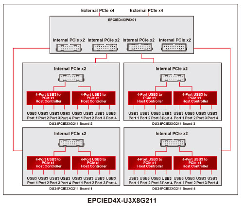 | The EPCIED4X-U3X8G211 is an Octad channel 32-port (4-port x 8) USB 3.0 to External PCI Express x8 Gen 2 Host Controller. EPCIED4X-U3X8G211 is designed with two key components.