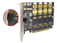 | QM2-PCIE16XB02 is four M.2 (Socket 3 Key M PCIe-based SSD Module Pinout) to PCI Express x16 Bifurcation Adapter. PCI Express bifurcation means splitting the PCI Express bus into smaller multi-slots . For example, one x16 PCI-Express Port can be bifurcated into four x4 PCI-Express Ports. This can be achieved from BIOS level if you want to split an existing lane. QM2-PCIE16XB02 is a cost-effective and useful solution for installing multiple M.2 PCIe SSD Modules. You can install four M.2 PCIe SSD Modules into the QM2-PCIE16XB02 then insert it into PCIe x16 slot on the computer. Please be noted that your mainboard needs to have PCIe bifurcation mode (x4, x4, x4, x4) support. |