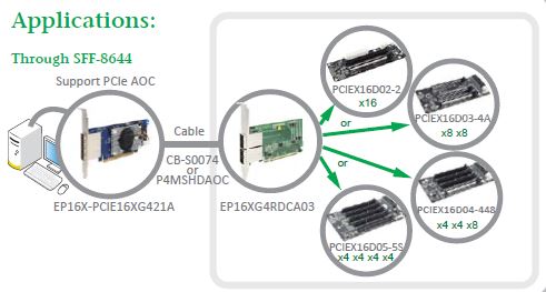 EP16X-PCIE16XG421A is External PCIe x16 (SFF-8644 1x4) to PCIe x16 Gen 4 Switch Host Card, it requires no additional software or drivers to operate. Utilizing the standard PCI Express Switch, the 36-Lane/20-Port PCI Express Gen 4 Switch provides the most efficient fan-out solution.