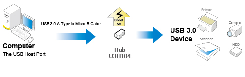 U3H104 is a high-performance one-port Universal Serial Bus (USB) 3.0 compliant Hub (Boost the USB Bus-Power Voltage), extending your USB 3.0 signals an additional length (3~8m). One upstream port and one downstream ports support not just SuperSpeed transfer, but are also backwards compatible with previous USB specifications and offer support for Hi-Speed (480Mbps), Full-Speed (12Mbps), and Low-Speed (1.5Mbps) traffic. U3H104 allows for a maximum data transfer rate of up to 5Gbps, or ten times the throughput available to USB 2.0 based devices. Other enhancements provide for improved interaction between device and host controller, including important advancements in power management. |